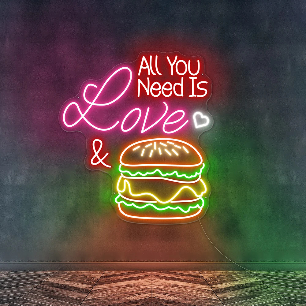 All You Need Is Love & Burger Neon Sign – Custom LED Fast Food Wall Decor